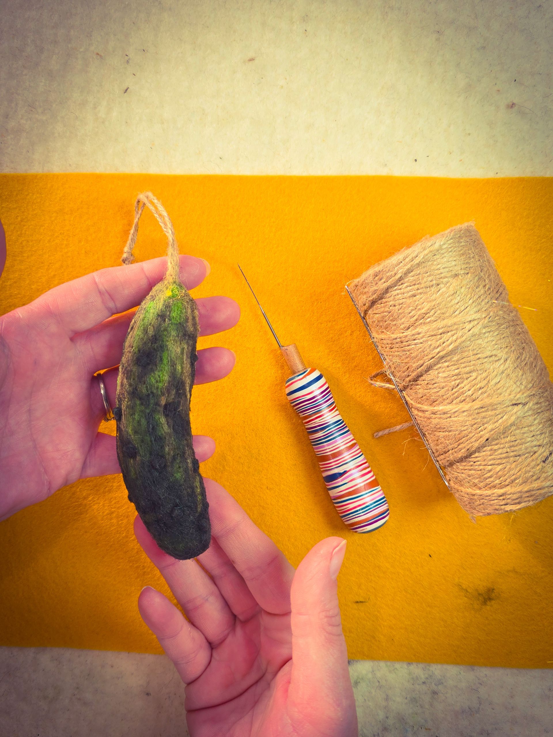 You’ll finish with a needle felted pickle ornament you can hang on the tree, gift to someone else, or keep as part of your own holiday traditions.
